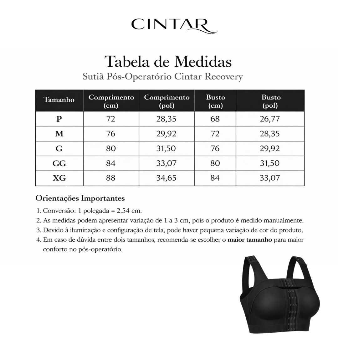 O Sutiã Pós-Operatório Cintar Recovery foi desenvolvido para oferecer suporte seguro, compressão equilibrada e máximo conforto durante o período de recuperação cirúrgica, auxiliando na estabilização da região mamária e favorecendo uma recuperação mais tranquila e protegida.